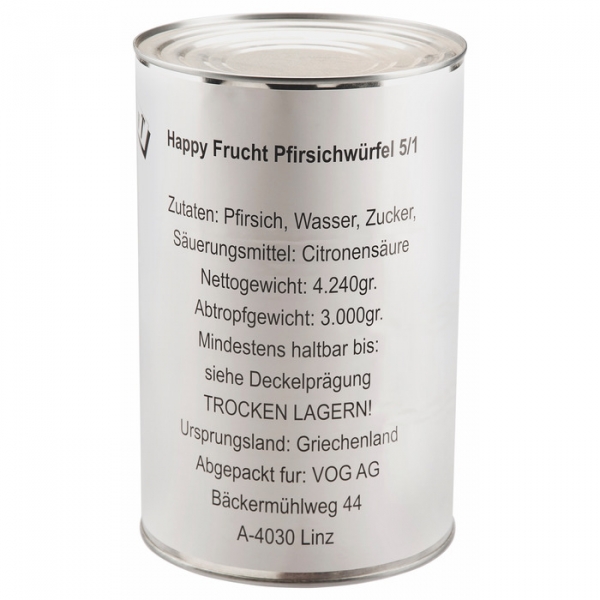 Nährwerte: (bezogen auf 100 GRM) Brennwert kJ: 273,0 kj Brennwert kcal: 64,0 kcal Fett ges.: 0,5 g Kohlenhydrate ges.: 15,0 g davon Zucker: 13,0 g Eiweiss: 0,5 g Salz: 0,0 g Allergenhinweis: leicht gezuckert Zutatenliste: Zutaten: Pfirsiche, Wasser, Zucker, Säuerungsmittel: Citronensäure. Aufbewahrungshinweis: Nach dem Öffnen in einem nicht metallischen Behälter gekühlt aufbewahren und innerhalb von 2 Tagen verbrauchen. Markeninhaber: VOG AG Linz Kontakt: VOG AG Adresse: Bäckermühlweg 44, A-4030 Linz |